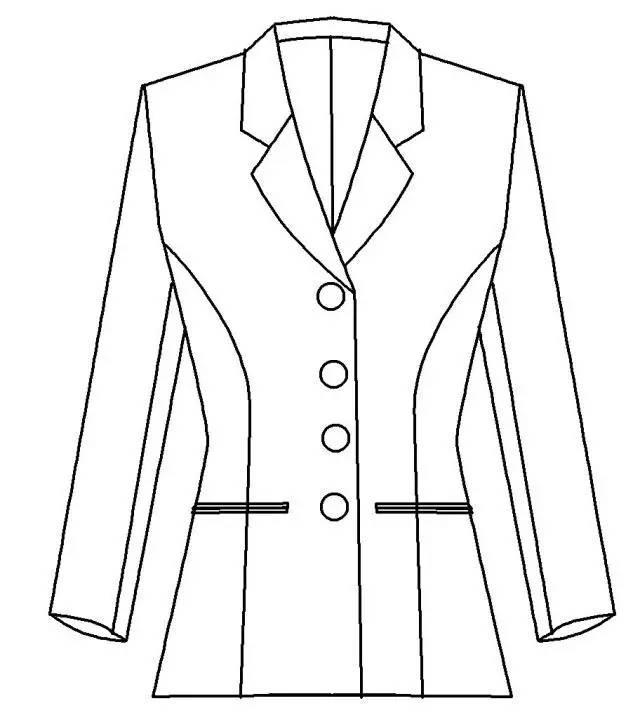 ①款式分析:八片身西装,刀背缝分割,八字领翻驳领,两片紧身袖。口袋双嵌线无袋盖。
