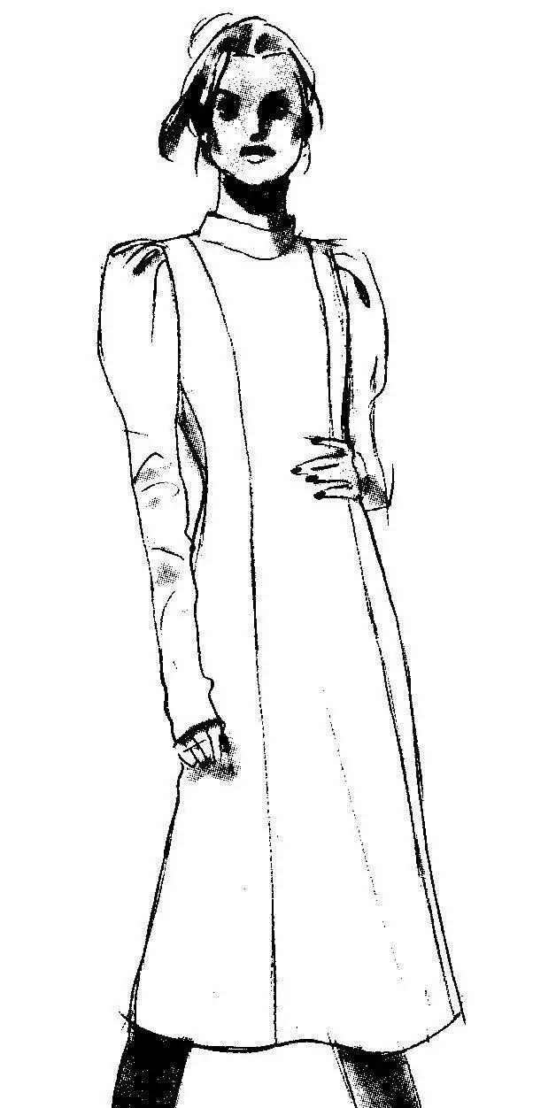 ①款式分析:公主线式连衣裙,下摆展开。领子为立式单片领,袖子是袖山富有丰满感的收碎褶、肘下收紧的羊腿式造型。