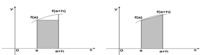 矩形法:用小矩形代替小曲边梯形,求出各小矩形的面积,然后累加之。如左图所示,对曲边梯形进行n等份后,第一个小矩形的底h=(b-a)/n,高为f(a),其面积s=h*f(a)。当然也可以用f(a+h)为高,这时的面积为s=h*f(a+h)