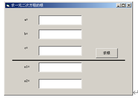 求一元二次方程ax2+bx+c=0的根。使用文本框控件输入a、b、c的值,然后单击“求根”命令按钮求出一元二次方程的根,其值显示在文本框中。提示:根据一元二次方程的系数a、b、c,通过b2-4ac判断求根的情况,并使该程序具有如图4-1所示的界面,窗体上的提示字符使用标签控件。