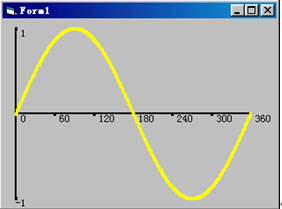 使用用户自定义坐标系统,在窗体上绘制正弦曲线。其主要思想为:使用Sin(X)分别获得X轴上的数据对应的Y值,并在(X,Y)处绘制对应的点,当这些点足够密集时,就形成了一条正弦曲线。本程序运行结果如图12-1所示。