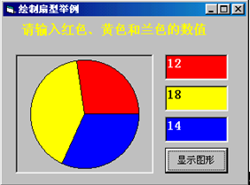 本程序主要用于根据用户输入的红色、黄色和蓝色的不同值(这些值都是大于0的),当单击“显示图形”按钮后,在Picture控件中根据数值绘制由红、黄、蓝组成的圆形,程序运行结果如图12-3所示。