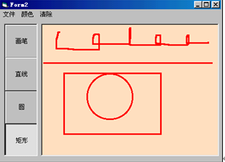 问题:在运行程序时,如果在单击任何颜色按钮之前,按下鼠标左键并在窗体上拖动鼠标,是否能画出线条?        ;如果能,它的颜色由什么决定?