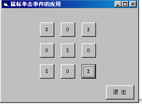 在窗体上有9个按钮排列成33列。当第135……次单击任意一个按钮时,被单击的按钮上显示字符“X”,当第246……次单击任意一个按钮时,被单击的按钮上显示字符“O”。程序运行效果如图13-2所示。