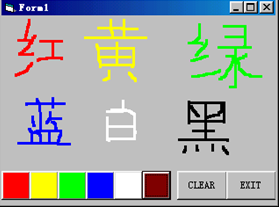 当单击窗体底部不同颜色的按钮后,在窗体上按下鼠标左键并拖动鼠标,可以绘制相应颜色的线条。单击“CLEAR”按钮,可清除窗体上的所有线条;单击“EXIT”按钮,终止程序的运行。本程序运行效果如图13-1所示。