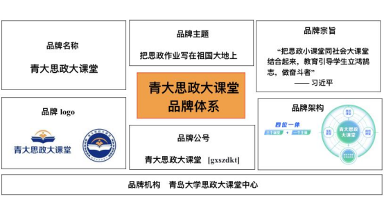 按照品牌建设要求,形成了包括品牌名称、品牌主题、品牌宗旨、品牌架构、品牌logo、品牌公号、品牌架构在内的完整的『青大思政大课堂』品牌体系。