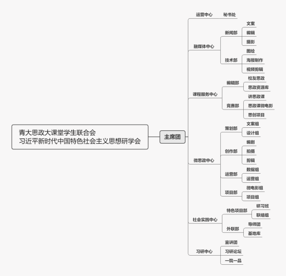 同时,思政大课堂根据实际工作的要求,将科学组织架构与实际情况相结合,不断更新联合会(习研会)的组织形式,保证了『青大思政大课堂』“四位一体”架构中“一个主体”始终具有积极向上的活力。